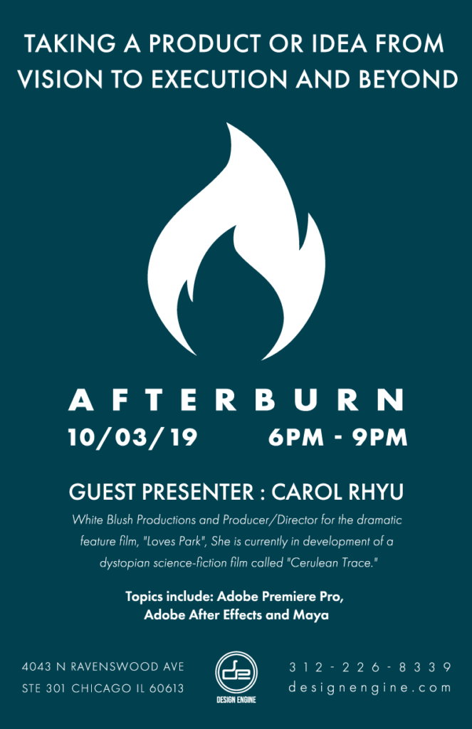 Guest Speaker: Carol Rhyu, Producer and Director at White Blush Productions. Studied at The American Film Institute Conservatory. Completed dramatic feature film, “Loves Park” with distribution partner, Global Genesis Group. This project made it to the second round of the Sundance Screenwriting Labs in 2014. As the producer and director, helped manage artistic and financial aspects of the film from financing to casting to budgeting, scheduling, production, and post-production supervision. Currently in development of a dystopian science-fiction film called “Cerulean Trace.”