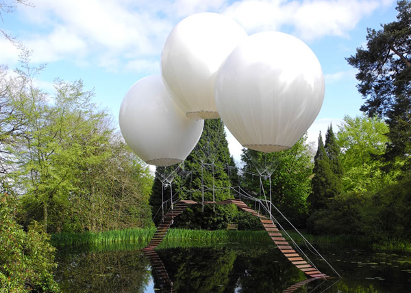 Bringing daydreams to life is what French artist Olivier Grossetête does best. Known for his visionary installation designs, this year for the United Kingdom’s Tatton Japanese Park Biennial, Grossetête designed Pont de Singe Bridge. Themed around flight, in an effort to test the boundaries of design this is Grossetête’s second floating infrastructure. “I like to compare the different types of laws, both physical and social.” Grossetête says. The artists first attempt at a zeppelin like bridge was in 2007, as the Pont Suspendu hovered over Château Ferry Lacombe in France.