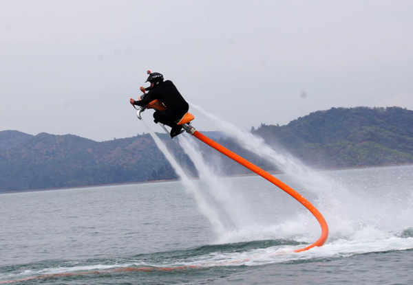 The Jetovator is a water sports accessory that extends the ability of an existing personal watercraft (PWC). The Jetovator does not come with its own power source and customers must acquire their own high output PWC in order to power the Jetovator. The Jetovator redirects the water thrust from the jet unit of the PWC along a forty foot hose to the Jetovator body. This water thrust is then used to propel and elevate the Jetovator into the air. The rider can also redirect the water thrust of the two front nozzles in order to maneuver the Jetovator in all directions.