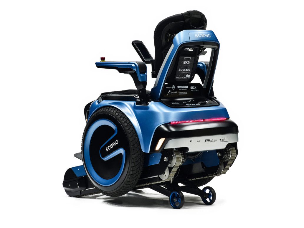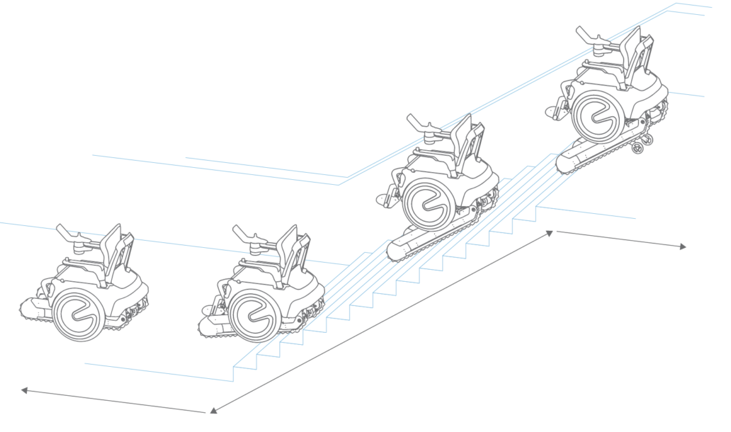 In addition to Driving Mode and Stair Mode, the Scewo also features an Elevated Mode that rises the wheelchair up to enable eye-to-eye communication and allows for reaching of higher lying objects. Whereas in Track Mode, the tracks are lowered to the ground for increased traction and can help when navigating slippery surfaces and bigger obstacles.